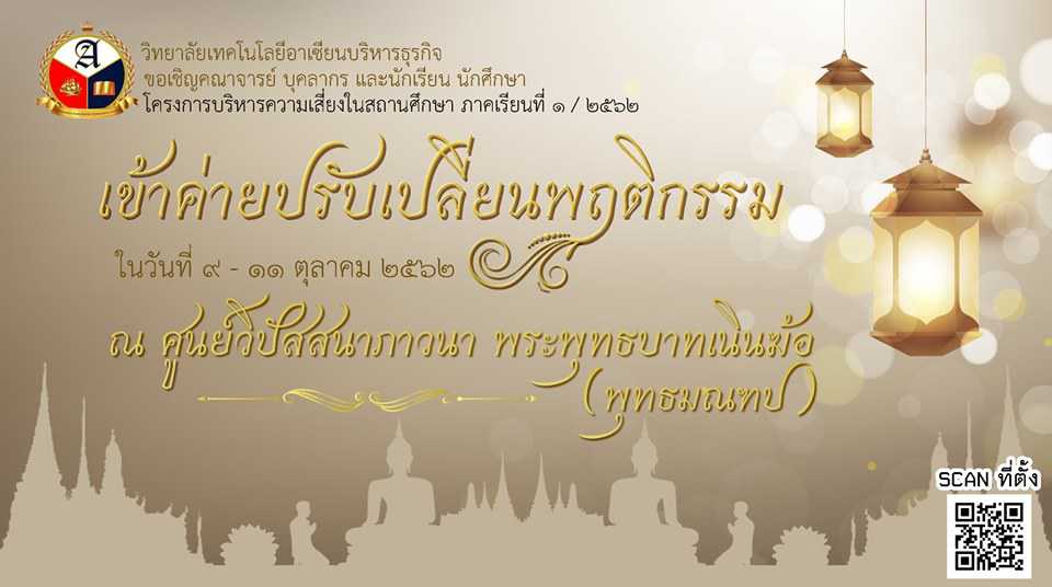 ประกาศแจ้งนักเรียน นักศึกษา เข้าค่ายร่วมโครงการบริหารความเสี่ยงในสถานศึกษา กับกิจกรรมการเข้าค่ายปรับเปลี่ยนพฤติกรรม ประจำภาคเรียนที่ 1 ปีการศึกษา 2562 ระหว่างวันที่ 9-11 ตุลาคม 2562 ณ ศูนย์วิปัสสนาภาว