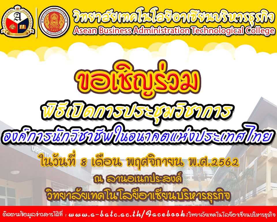 ???? ประกาศ ???? ขอเชิญชวนผู้ที่สนใจเข้าร่วมพิธีเปิดการประชุมวิชาการ องค์การนักวิชาชีพในอนาคตแห่งประเทศไทย ในวันที่ 8 พฤศจิกายน 2562 ???? ณ ลานอเนกประสงค์ วิทยาลัยเทคโนโลยีอาเซียนบริหารธุรกิจ ???? ??