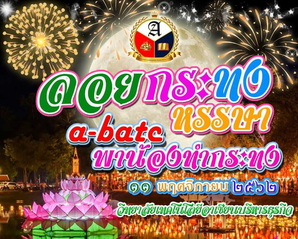 ประกาศ ขอเชิญชวนผู้ที่สนใจเข้าร่วม " ลอยกระทงหรรษา A-BATC พาน้องทำกระทง " ในวันที่ 11 พฤศจิกายน 2562 ???? ณ ลานอเนกประสงค์ วิทยาลัยเทคโนโลยีอาเซียนบริหารธุรกิจ ???? ???? : พิธีเปิดและการแสดง ???? :