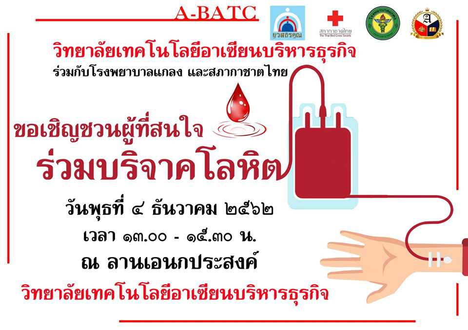 ????????ประกาศ???????? ?? ขอเชิญชวนผู้ที่สนใจร่วม " บริจาคโลหิตเนื่องในวันพ่อแห่งชาติ " ?? ในวันพุธที่ ๔ ธันวาคม ๒๕๖๒ เวลา ๑๓.๐๐ น. เป็นต้นไป ณ วิทยาลัยเทคโนโลยีอาเซียนบริหารธุรกิจ