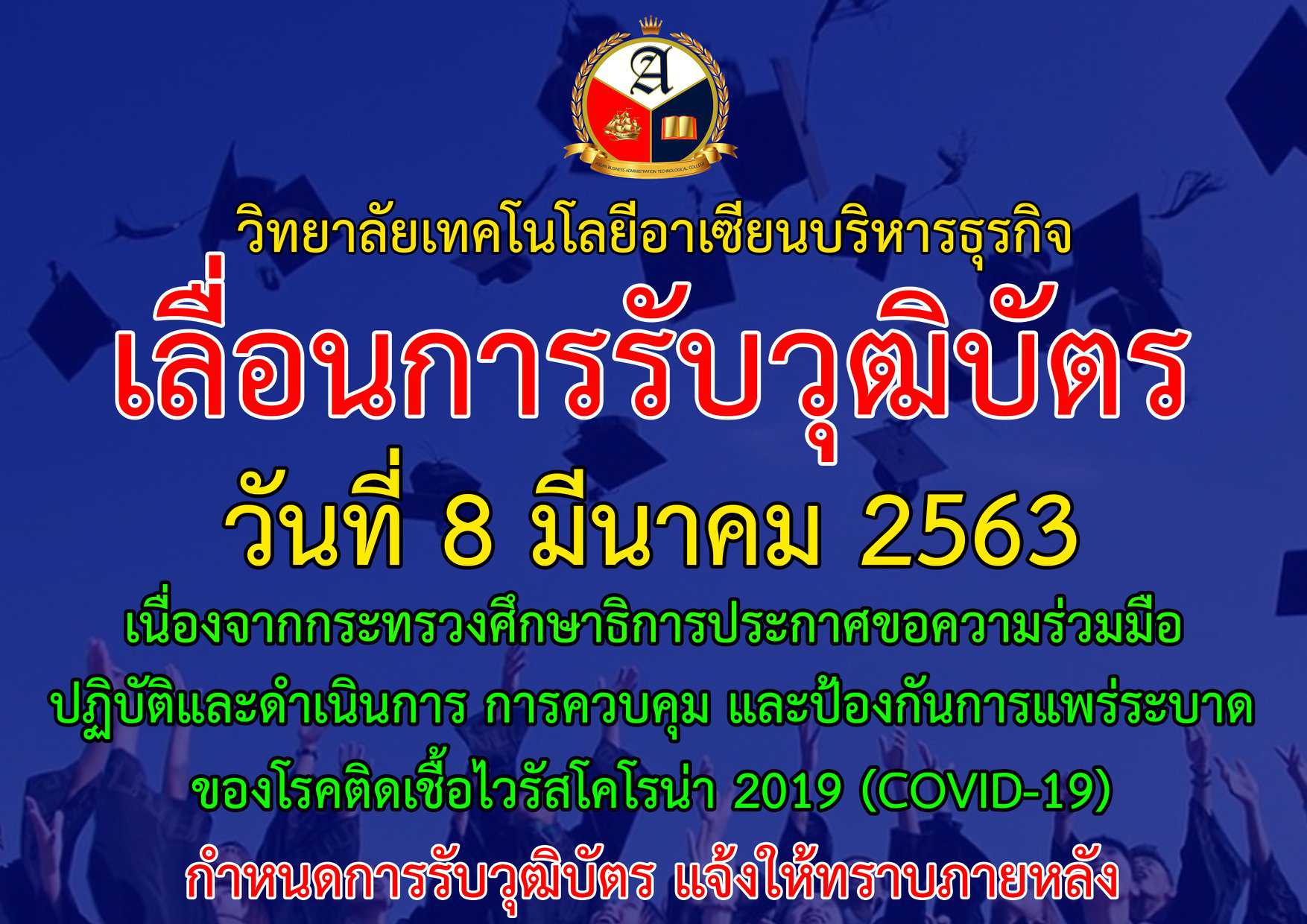 เนื่องจากเชื้อไวรัสโควิด-19 ได้ทวีความรุนแรงขึ้นทางวิทยาลัย จึงขอเลื่อนกำหนดการรับวุฒิบัตรกันก่อนนร้าเด็กๆ มีกำหนดการใหม่จะรีบแจ้งทันที