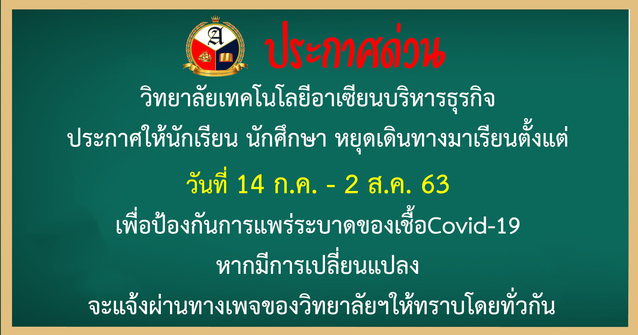 ทั้งนี้ วิทยาลัยเทคโนโลยีอาเซียนบริหารธุรกิจ ขอประกาศ แจ้งให้นักเรียน นักศึกษา ทุกคน