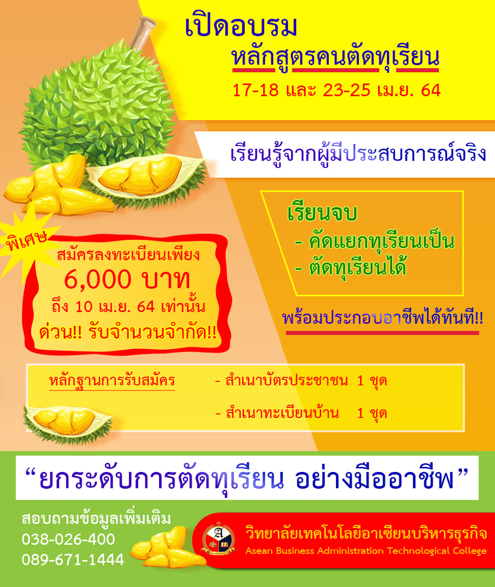 เปิดรับสมัครผู้สนใจเรียนหลักสูตรวิชาชีพระยะสั้น "หลักสูตรคนตัดทุเรียน" 30 ชั่วโมง
