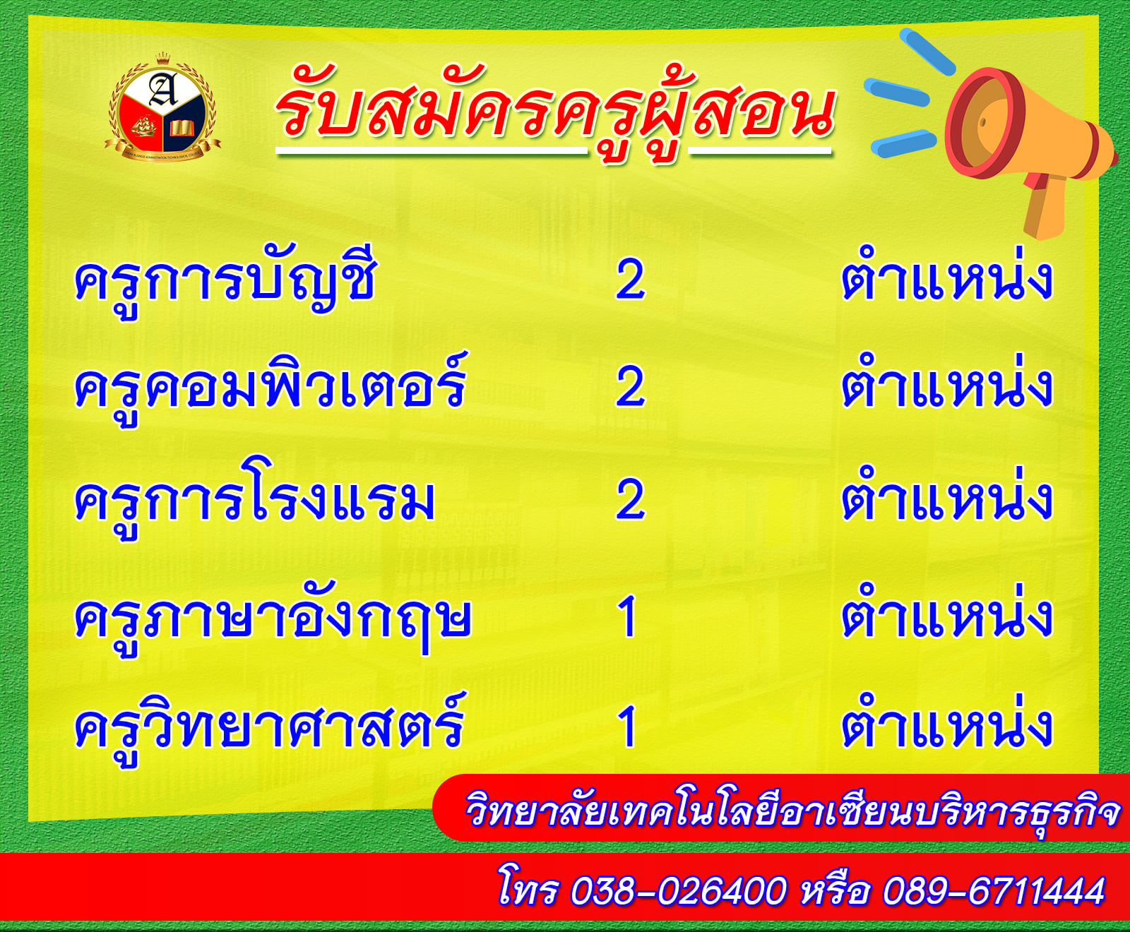 - ครูภาษาอังกฤษ 1 ตำแหน่ง