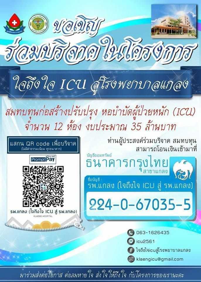 ขอเชิญชวนนักเรียน นักศึกษา วิทยาลัยเทคโนโลยีอาเซียนบริหารธุรกิจ และพี่น้องชาวอำเภอแกลงร่วมโครงการ "ใจถึงใจ ICU สู่โรงพยาบาลแกลง" เพื่อสมทบทุนสร้างห้อง ICU 3 โรงพยาบาลแกลง