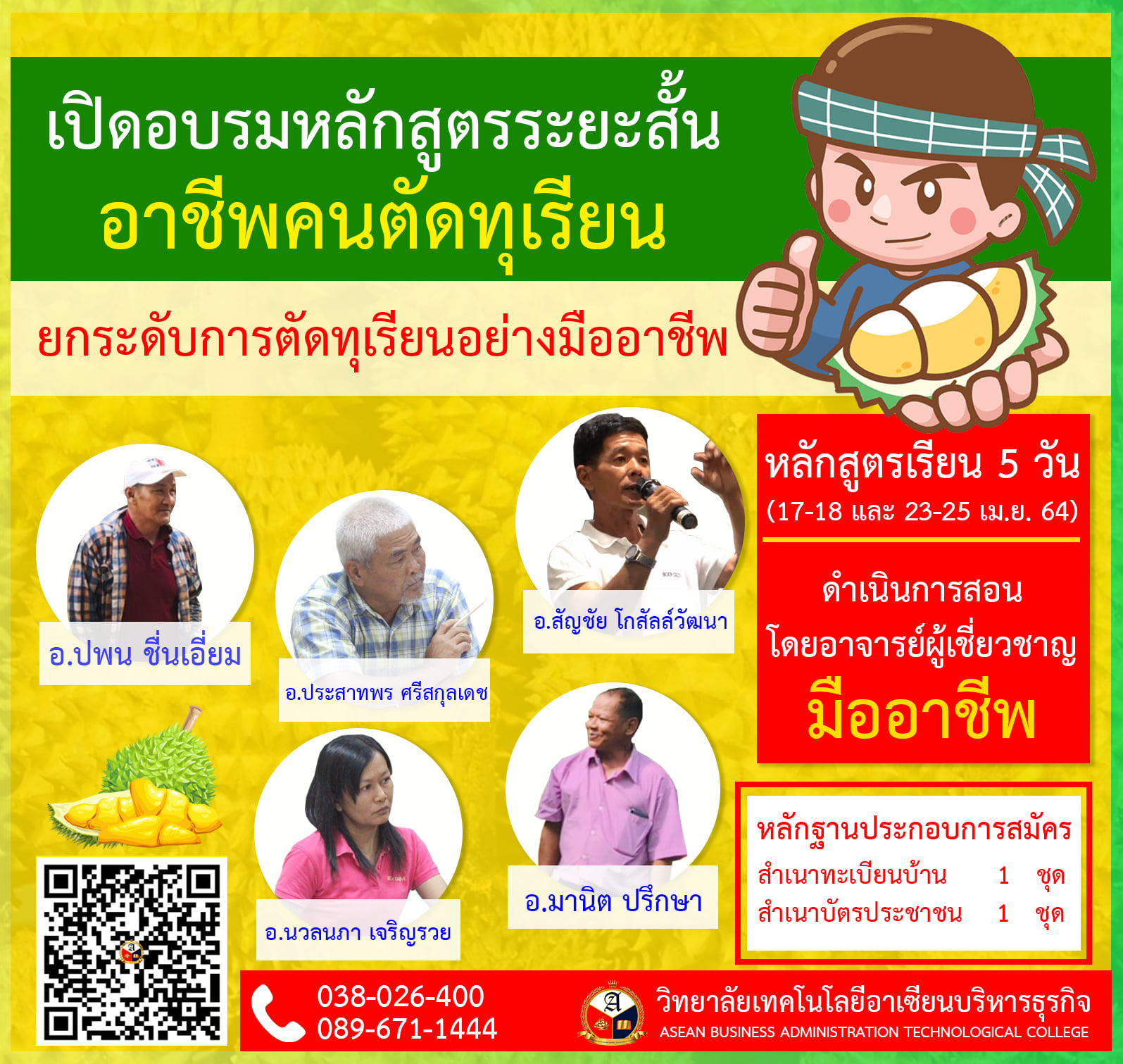 เปิดรับสมัครผู้สนใจเรียนหลักสูตรวิชาชีพระยะสั้น "หลักสูตรคนตัดทุเรียน" หลักสูตร 5 วัน (17 - 18 และ 23 - 25 เมษายน 2564)