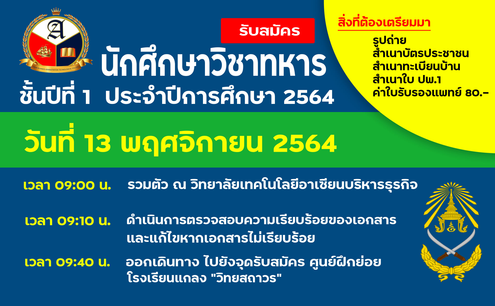 แจ้งผู้สมัครนักศึกษาวิชาทหาร ชั้ันปีที่ 1 ประจำปีการศึกษา 2564
