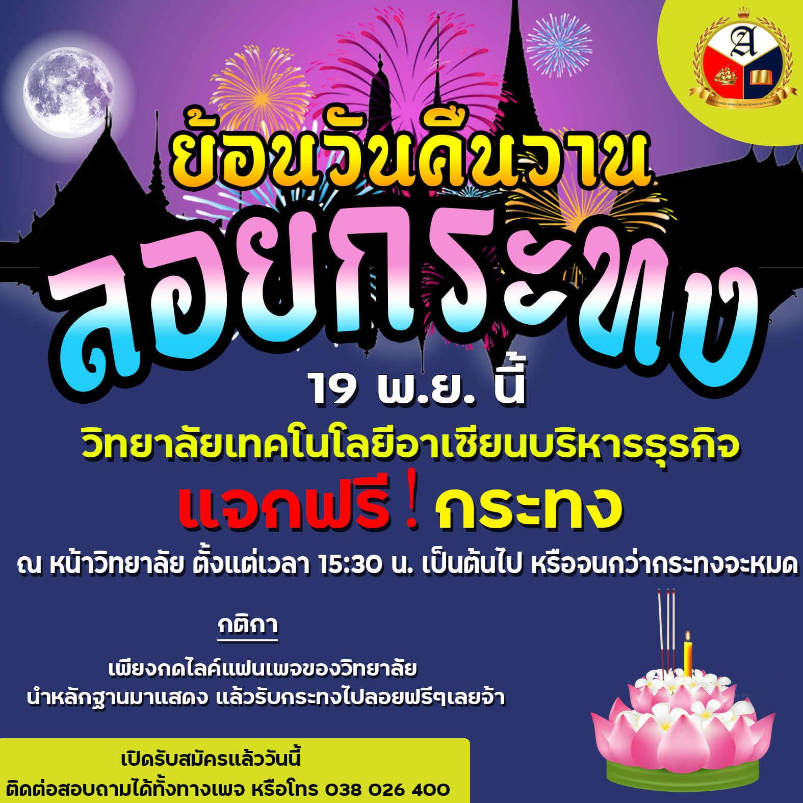 ฟังทางนี้! วิทยาลัยเทคโนโลยีอาเซียนบริหารธุรกิจ มีกระทงแจกให้ฟรี