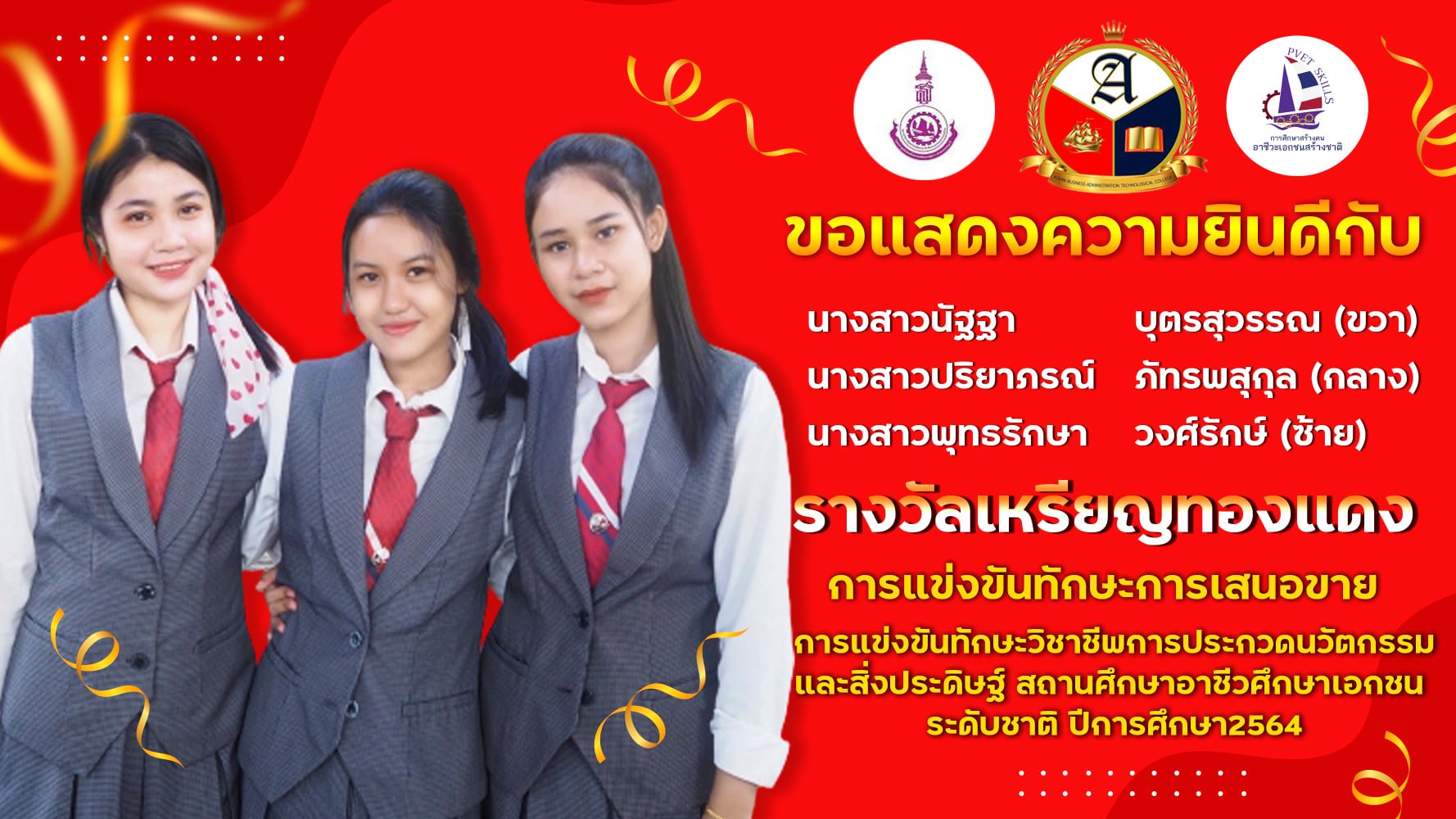 วิทยาลัยเทคโนโลยีอาเซียนบริหารธุรกิจ ขอแสดงความยินดีกับ ทีมนักเรียนที่เข้าร่วมการแข่งขันทักษะวิชาชีพ การแข่งขันทักษะการเสนอขาย ที่ได้รับรางวัล ดังนี้