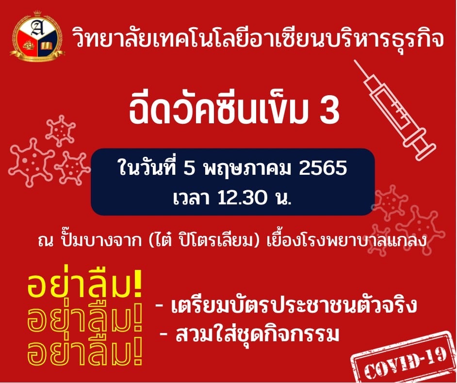 วันพฤหัสบดีที่ 5 พฤษภาคม 2565 ขอให้นักเรียนระดับปวช. เข้ารับการฉีดวัคซีนไฟเซอร์ (Pfizer) ฝาม่วงเข็มกระตุ้น ที่ปั๊มบางจาก ไต๋ปิโตรเลียม ตั้งแต่เวลา 12.30 น. โดยให้ผู้ปกครองไปด้วย เนื่องจากต้องกรอกเอกสารและเซ็นรับรองอนุญาตการฉีดวัคซีน
