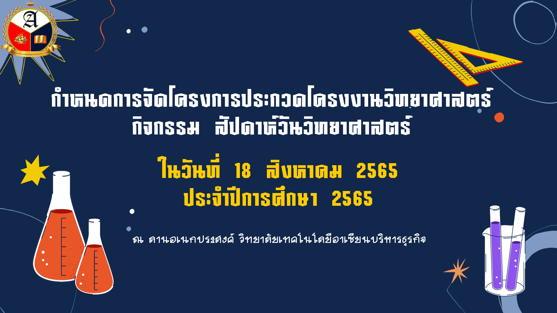 ขอเชิญเข้าร่วมโครงการประกวดโครงงานวิทยาศาสตร์ กิจกรรมสัปดาห์วันวิทยาศาสตร์ ประจำปีการศึกษา 2565 จะเกิดขึ้นในวันที่ 18 สิงหาคม 2565