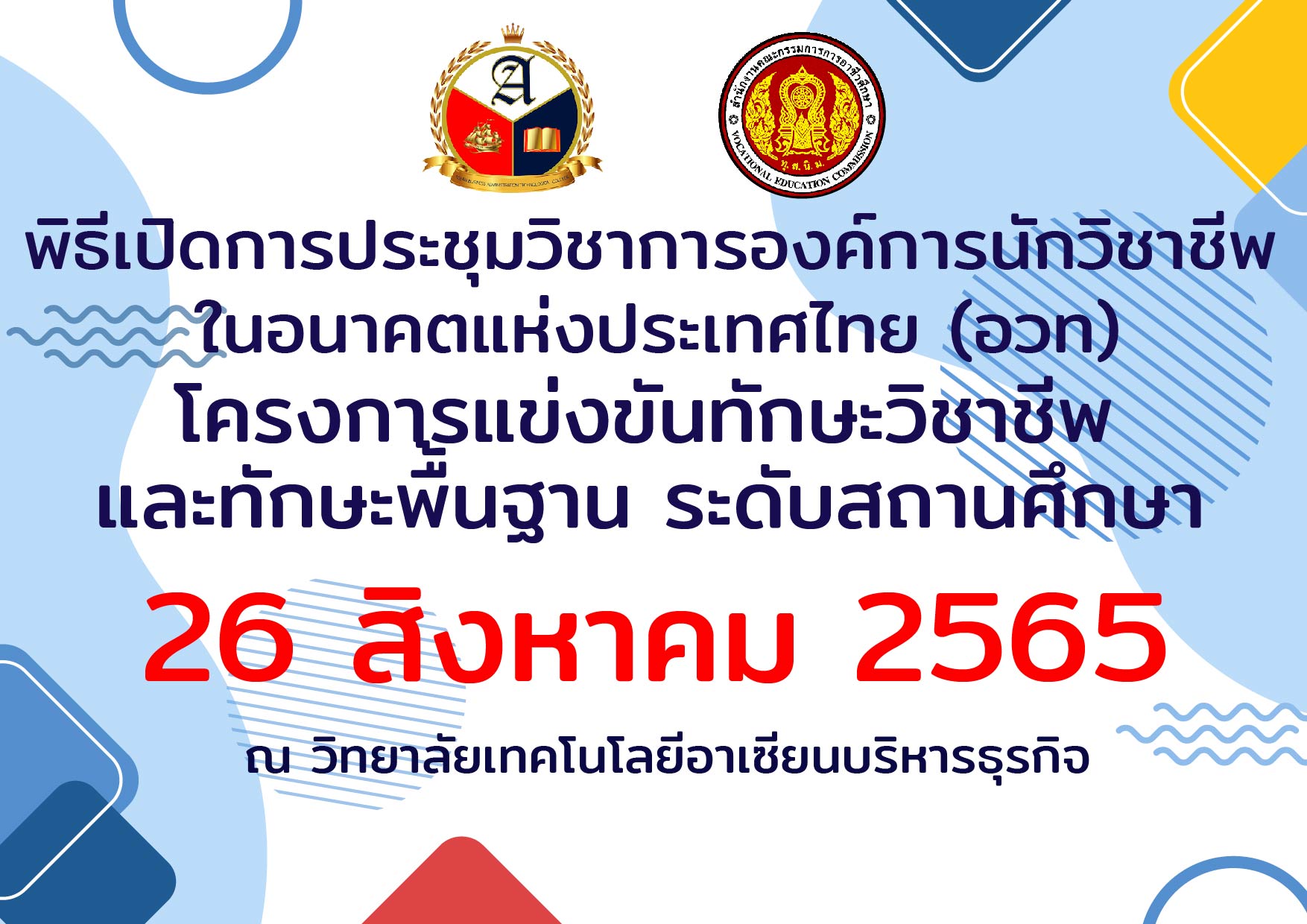 ขอเชิญเข้าร่วมพิธีเปิดการประชุมวิชาการองค์การนักวิชาชีพในอนาคตแห่งประเทศไทย โครงการแข่งขันทักษะวิชาชีพและทักษะพื้นฐาน ระดับสถานศึกษา ในวันที่ 26 สิงหาคม 2565