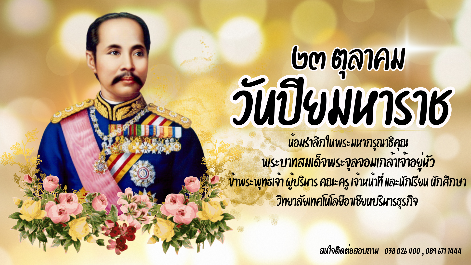 วันปิยมหาราช 23 ต.ค.ของทุกปี น้อมรำลึกในพระมหากรุณาธิคุณ "พระบาทสมเด็จพระจุลจอมเกล้าเจ้าอยู่หัว" พระมหากษัตริย์ที่ทรงบำเพ็ญพระราชกรณียกิจนานัปการ ทั้งเลิกทาส และทรงนำพาประเทศชาติให้ก้าวสู่ความทันสมัยในด้านสังคม การศึกษา การคมนาคม