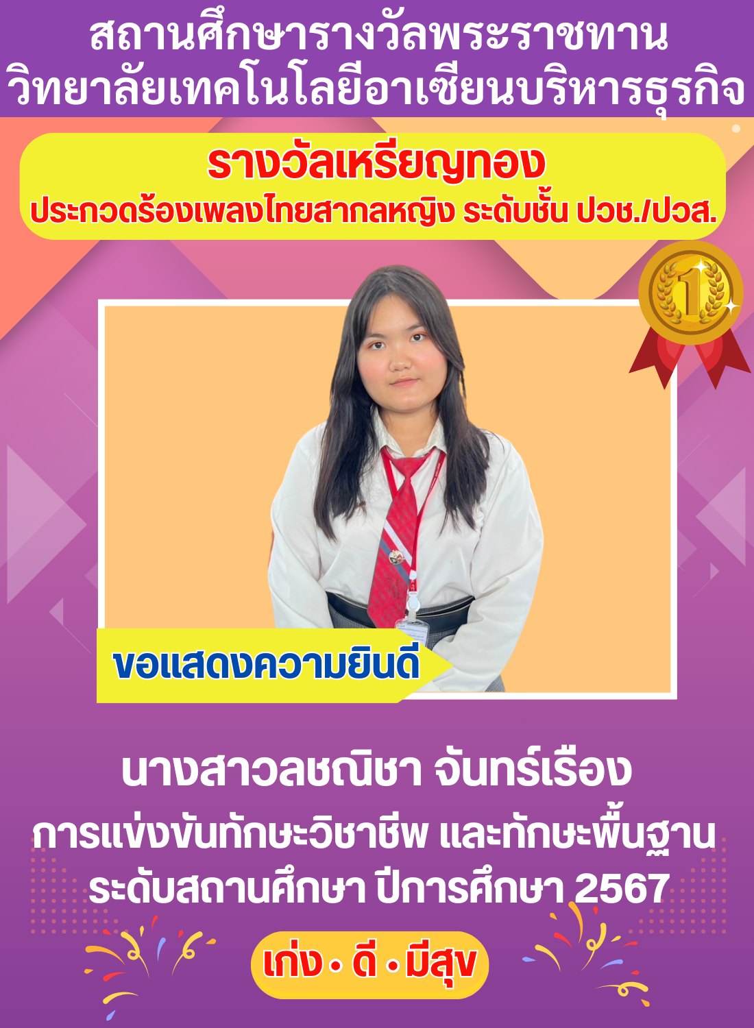 ขอแสดงความยินดี กับ นางสาวลชณิชา จันทร์เรือง ปวช.3 สาขาการบัญชี ได้รับรางวัลระดับเหรียญทอง ประกวดร้องเพลงไทยสากลหญิง ระดับ ปวช./ปวส. ในการแข่งขันทักษะวิชาชีพ และทักษะพื้นฐาน ระดับสถานศึกษา ปีการศึกษา 2567