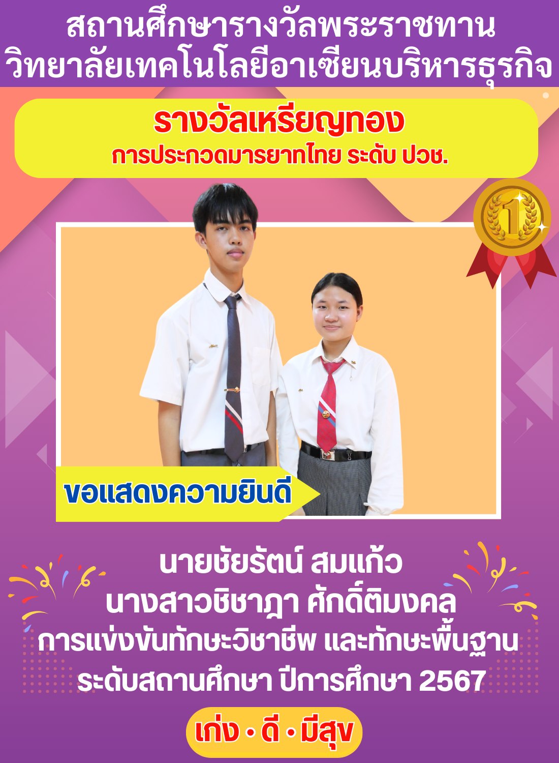 ขอแสดงความยินดี กับ นายชัยรัตน์ สมแก้ว และนางสาวชิชาฎา ศักดิ์ติมงคล ปวช.1 สาขาการตลาด ได้รับรางวัลระดับเหรียญทอง การประกวดมารยาทไทย ระดับ ปวช. ในการแข่งขันทักษะวิชาชีพ และทักษะพื้นฐาน ระดับสถานศึกษา ปีการศึกษา 2567