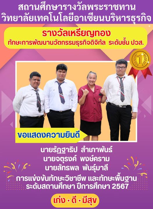 ขอแสดงความยินดี กับ นายรัฏฐาธิป สำเภาพันธ์, นายจตุรงค์ พงษ์คราม และนายลัทธพล พันธ์ุมาลี ปวส.2 สาขาเทคโนโลยีธุรกิจดิจิทัล