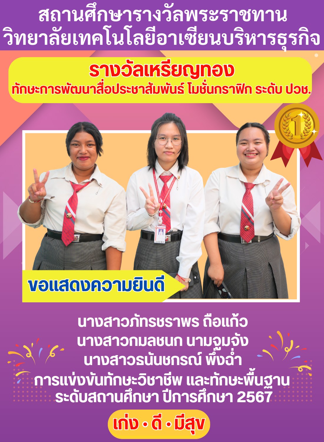 ได้รับรางวัลระดับเหรียญทอง การแข่งขันทักษะการพัฒนาสื่อประชาสัมพันธ์ โมชั่นกราฟิก ในการแข่งขันทักษะวิชาชีพ และทักษะพื้นฐาน ระดับสถานศึกษา ปีการศึกษา 2567
