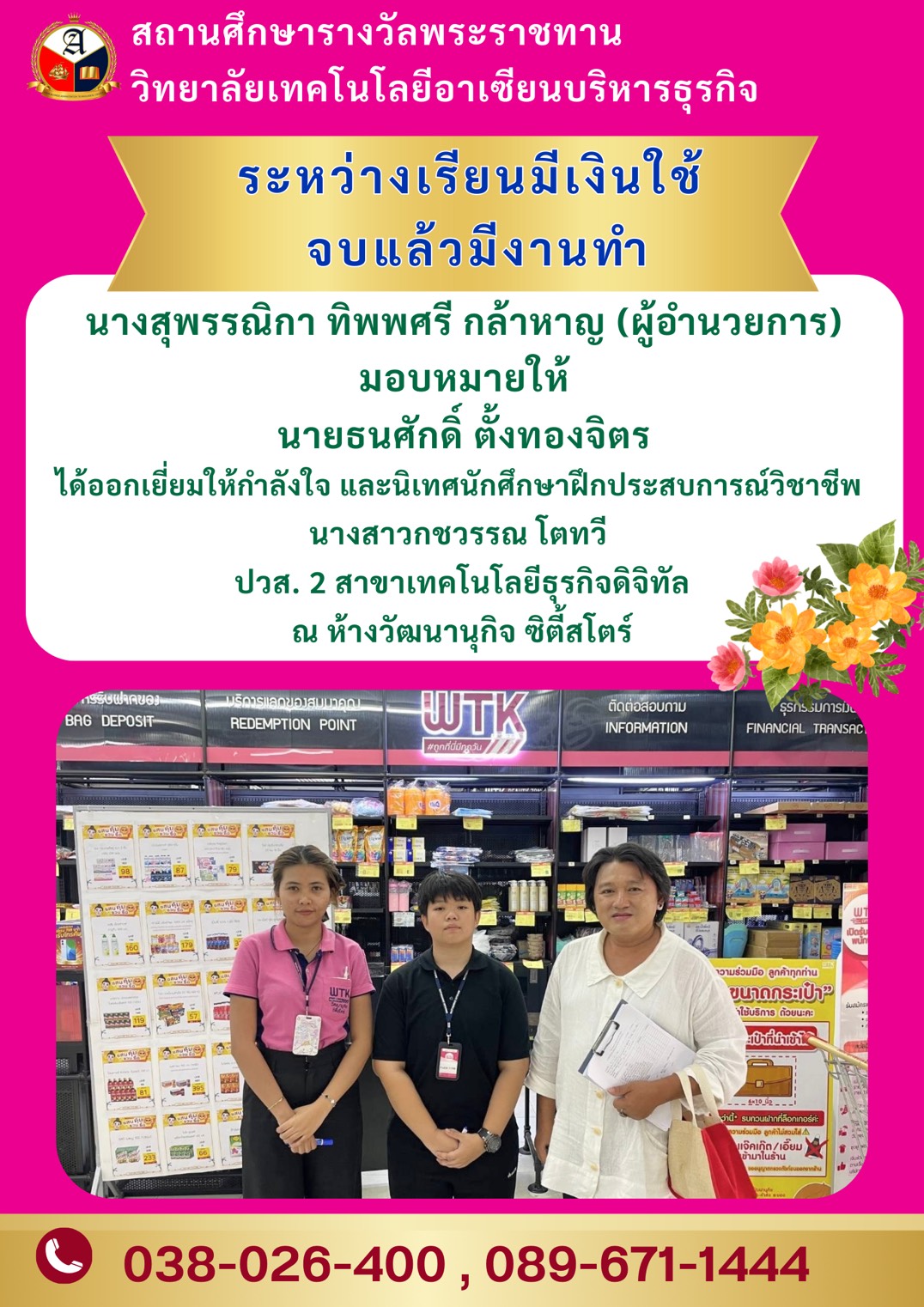 นางสุพรรณิกา ทิพพศรี กล้าหาญ (ผู้อำนวยการ) มอบหมายให้ นายธนศักดิ์ ตั้งทองจิตร ได้ออกเยี่ยมให้กำลังใจ และตรวจเยี่ยมนิเทศนักศึกษาฝึกประสบการณ์วิชาชีพ