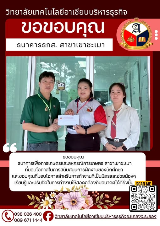 ขอขอบคุณ ธนาคารเพื่อการเกษตรและสหกรณ์การเกษตร สาขาเขาชะเมา ที่มอบโอกาสในการสนับสนุนการฝึกงานของนักศึกษาและขอบคุณที่มอบโอกาสสำหรับการทำงานที่เป็นมิตรและช่วยน้อง ๆ เรียนรู้และปรับตัวในการทำงานให้สอดคล้องกับอนาคตได้ดียิ่งขึ้น